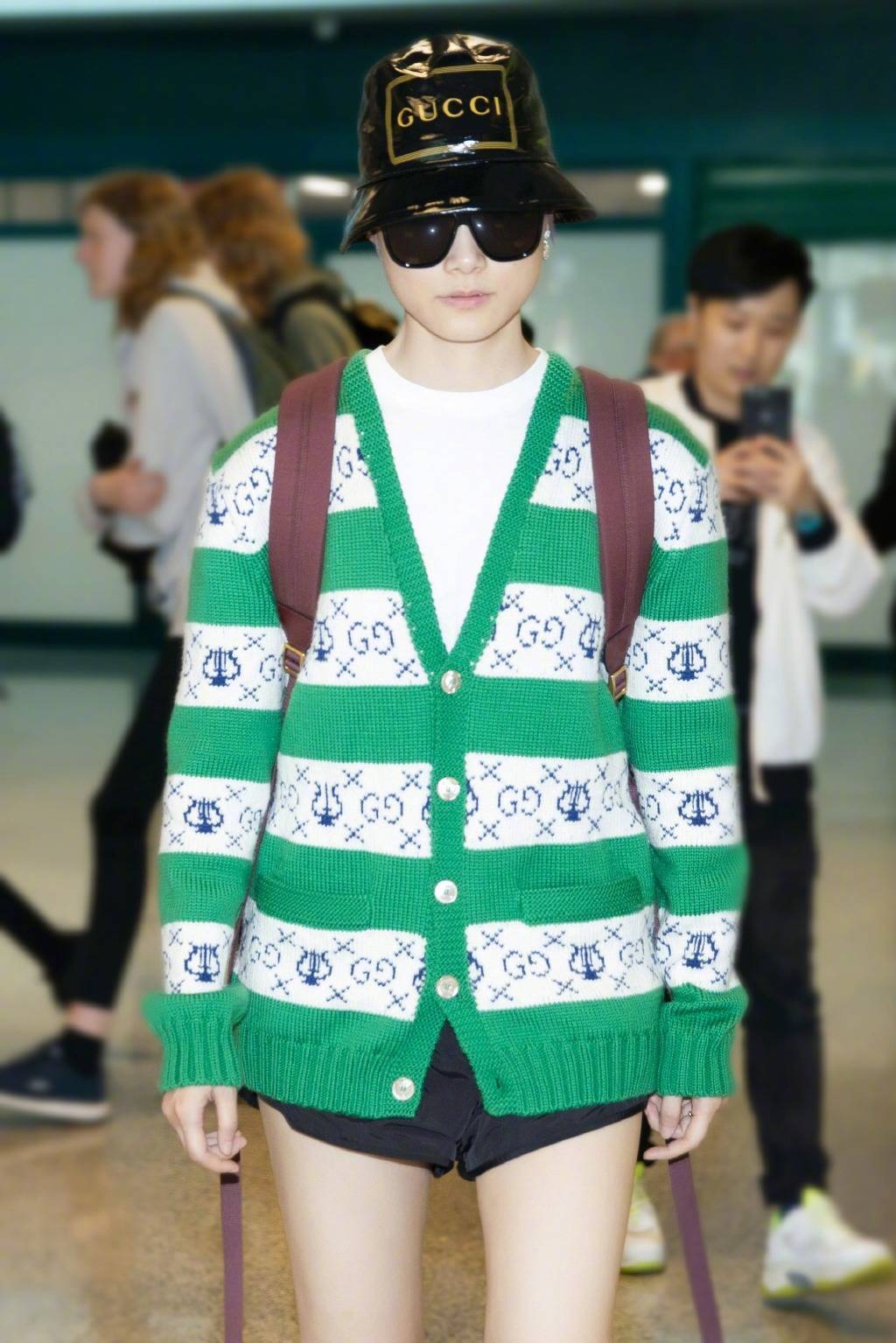 针织毛衣的搭配相信大家都很了解,在李宇春下面这身搭配中,她选择绿色的针织开衫,上面结合白色和绿色条纹,有一定亮点,白色条纹上面还结合印花修饰,更能够增强时尚感。然后在针织开衫里面搭配了白色t恤,简单又时髦,层次感很强。